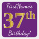 Este sencillo diseño de pegatina de cumpleaños incluye un mensaje como "¡Cumpleaños 37 de FirstName!", con el "37" con un aspecto de color falso/imitación de oro inspirado en el oro, sobre un fondo morado. El nombre se puede personalizar. Pegatinas como estos podrían ser tal vez un regalo para alguien que esté celebrando su 37 cumpleaños, o tal vez podrían ser usados como decoraciones en una fiesta de cumpleaños. [~Z0000246]