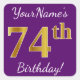 Este sencillo diseño de pegatina de cumpleaños incluye un mensaje como "¡Cumpleaños 74 de tu nombre!", con el "74″ que tiene un aspecto de color falso/imitación de oro, en un fondo de color morado. El nombre se puede personalizar. Pegatinas como estos podrían ser tal vez un regalo para alguien que esté celebrando su cumpleaños setenta y cuatro, o tal vez podrían ser usados como decoraciones en una fiesta de cumpleaños. [~Z0000246]
