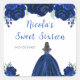 Este pegatina dulce de dieciséis años cuenta con flores florales falsas color azul marino purpurina y una hermosa princesa con pelo castaño y un vestido elegante. Es perfecto para una dulce fiesta de 16 años.