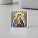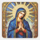 "This exquisite design features a portrait of the Virgin Mary rendered in a rich, detailed mosaic style. She is depicted with a serene expression, eyes closed in prayer, and hands clasped. She is cloaked in a deep blue mantle adorned with gold trim and stars, set against an arched background of a radiant sunburst and starry sky. The intricate mosaic texture and golden accents give the image a sense of sacred grandeur and timeless artistry. This design is highly suitable for products with a religious, historical, or classic art theme. Imagine it on religious icons, devotional items, framed art prints, or elegant stationery."