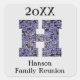 Cree un pegatina único y barato para su próxima reunión familiar. La hermosa letra H monograma presenta un diseño de mosaico o de vidrio manchado en colores violeta, azul y negro, sobre un fondo gris claro que puede ser personalizado si lo desea. Personalice rápidamente con el nombre de su familia y el año para crear un hermoso pegatina adecuado para ser utilizado como sello para sobres o para sus aventuras de scrapbook. Los pegatinas también son muy divertidos para la generación más joven que asiste a tu reunión.