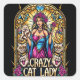 Un ilustracion estilizado representa a una mujer elegante con el pelo castaño flotante vestido de azul, con un gatito en la cuna y rodeada de múltiples gatos. El fondo presenta diseños complicados, rosas y la frase "Crazy Cat Lady" con letras en negrita, todo encerrado dentro de un marco ornamentado.