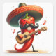Un alegre pimienta roja antropomórfica con un sombrero largo y bigote negro mientras tocas una guitarra