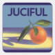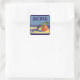 Anuncio artístico con etiqueta de crema de fruta de ilustracion de época con un naranja orgánico maduro que se relaja en una playa de arena con algunas hojas que proyectan una sombra. El océano azul está a lo lejos. Naranjas juiciosos en vacaciones de verano, lejos de la huerta de la granja.