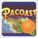 Anuncio artístico con etiqueta de caja de fruta de ilustracion de época con un naranja grande, maduro y orgánico con flores y un mapa de la costa sur del estado de California con el océano Pacífico azul. Publicidad retro para naranjas de marca Pacoast, cítricos frescos de la granja. Alimentos saludables con vitamina C.