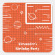 Pegatinas de cumpleaños con tema espacial para la fiesta de cumpleaños de tus hijos. Añádelos a los detalles de tu fiesta o regálalos como recuerdo. El fondo representa una pantalla de computadora naranja donde aparecen todos los elementos de color blanco, incluyendo el texto que puedes personalizar. Personalízalo con tu propio mensaje. Ilustrado y diseñado por Patricia Alvarez.