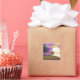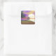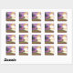 Pegatinas con mis obras de arte de una escena tropical con un velero navegando frente a una isla y palmeras con un sol abrasador en un cielo de nubes violetas y amarillas.