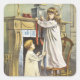 Ilustración vintage de la imagen de la fiesta de Navidad Victoriana con hermanos, un hermano y una hermana trabajando juntos. El buen chico y la buena chica están colgando las medias junto a la chimenea en Nochebuena esperando a Santa Claus. La noche antes de Navidad de William Roger Snow, 1918.