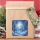 Una bella pegatina navideña para añadir a sus Navidades tarjetas o regalos de una escena de árboles, nieve y un río con carpintería azul