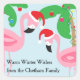 Pegatinas navideñas de temática playera con aves flamingo rosadas usando sombreros Santa. Las palmeras están decoradas con adornos y lámparas de época. Envíe una cálida bienvenida de invierno a sus amigos y familiares con estas divertidas y extravagantes etiquetas. Copyright Bendel Creative Design LLC Todos los derechos reservados.