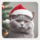 Un gatito de pelo corto británico azul/gris con un sombrero de Santa.