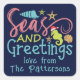 Los Pegatinas de la Plaza de los Navidades de verano de Seas and Greetings Beach presentan el texto "Mares y saludos" en la tipografía moderna de escritura caligráfica acentuada con un caballito de mar festivo y conchas marinas con tu nombre personalizado. Creado por Evco Studio www.zazzle.com/store/evcostudio
