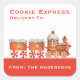 Nuestra divertida y colorida etiqueta de Pegatina Gingerbread Cookie Express Square incluye un ilustracion acuático de galletas de Gingerbread en forma de tren con escarcha blanca de vainilla, acentos de gota, locomotora de pan de jengibre y ruedas hechas de caramelos de menta a rayas rojas y blancas. El texto dice "Cookie Express" "Entrega a:" y se puede actualizar con su propio texto personalizado para hacer un pegatina personalizado para regalos de vacaciones, bolsos de favor y paquetes.