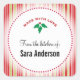 Este pegatina cuadrado presenta un fondo con estribos verticales rojo y dorado, un círculo blanco acentuado con Navidades verdes y el texto: HECHO CON AMOR desde la cocina de: (texto de personalizable para que añadas tu nombre). Este pegatina personalizado es perfecto para sellar artículos de Navidad que has horneado como regalo para una persona especial.
