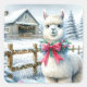 Pegatinas cuadradas de Navidad con temática agrícola. Granja vintage con una Alpaca en el exterior en un día de invierno nevado.