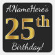 Pegatina Cuadrada Negro, Faux Gold 25th Birthday + Nombre personaliz