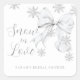 Agrega un toque dulce y nevado a los recuerdos, sobres o decoración de tu fiesta de compromiso con estas elegantes pegatinas "Snow in Love" (Nieve enamorada). Con una tipografía romántica, copos de nieve plateados y un delicado lazo coqueto blanco, estas pegatinas son el detalle perfecto para tu celebración invernal.