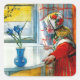 acuarela de época en colores vivos. Niña pequeña con vestido rojo y gorra mira un jarrón de iris sentado sobre la mesa. Fina de arte del pintor sueco Carl Larsson.