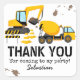 Niños de la construcción de cumpleaños gracias a pegatinas que presentan un simple fondo blanco, con lindos ilustraciones personalizados de un digger, un camión de cemento, conos de tráfico, manchas de suciedad y una plantilla de agradecimiento que es fácil de personalizar.