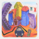 Una pintura colorida, divertida e imaginativa que representa a alguien en un auto saliendo de un pueblo con edificios doblados.