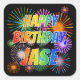 Pegatina Cuadrada Nombre "JASE", diversión "FELIZ CUMPLEAÑOS"