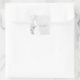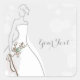 Pegatina bonito con un boceto de novia vestido de bata blanca con ramo sobre fondo gris claro con un fondo de círculo al azar. Un toque perfecto como sello para sobres, favorece las bolsas o las cajas.