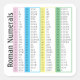 Un pegatina que tiene los números romanos de 1 a 100. Resulta muy útil cuando tratas de averiguar qué significan los números romanos en algo. También es útil como una gran ayuda para la enseñanza para niños y adultos. Tiene las palabras "números romanos" a lo largo del lado izquierdo, luego a la derecha tiene los números regulares en las tiras de color y a la derecha de cada tira de color está el número romano para ese número. Puedes usar a estos pegatinas como material didáctico, meterlos en un libro o pegarlos donde creas que funcionan mejor.