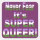 "Nunca teman que sea super gay" en los colores transgénero de la bandera del Orgullo Gay (púrpura, verde y blanco) con el símbolo transgénero