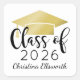 Las pegatinas personalizadas de graduación tienen un diseño personalizado moderno y elegante con el nombre del graduado, su año de clase en escritura de caligrafía negra de moda, y un motivo de gorra de graduado de color dorado. ¡Use para acentuar sobres de tarjetas de anuncio o favores de fiesta de graduación!