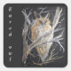 Una hermosa acuarela de un búho con tonos dorados sobre un árbol, sobre un fondo negro.