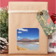 Foto pegatina de recuerdo con un paisaje con un volcán nieves reflejado en un lago y hierba amarilla en el desierto de Atacama cerca de Uyuni en la frontera entre Bolivia y Chile en la altitud del Altiplano en las montañas andinas.