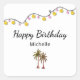 Pegatina de la fiesta de cumpleaños Tropical Beach, con elegantes palmeras y luces de cuerda en un fondo blanco. Con letras de tipografía de personalizable, añades tu propia información. Una divertida adición a la planificación de fiestas de celebración inspirada en tu playa.