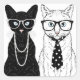 Este diseño presenta un gato negro de sexo femenino vestido con collar de perlas y un gato blanco de sexo masculino vestido con corbata de puntos.