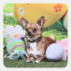 Situado en un colorido entorno de Pascua, este Chihuahua se sienta para su retrato de Pascua de 2013. El telón de fondo tiene cuatro grandes huevos de Pascua amarillos, verdes y blancos sentados en la Grasa de Pascua resaltados con un cielo azul brillante. Ver la sesión fotográfica completa, hacer clic en www.FrankzPawPrintz.photoreflect.com