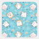 Pegatinas con un bonito patrón de gato, colocados en un fondo azul y decorados con arcos de lluvia, huellas de pata y más.