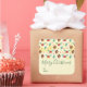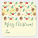 Feliz pegatinas navideños con un lindo patrón de pinos y un hueco sobre un fondo acuático amarillo con pequeños círculos blancos esparcidos por ahí.