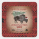 Granja de árboles de Navidad: ilustracion temático de un búfalo con sombrero de santa y árbol de Navidad cubierto de nieve atado a la espalda. Fondo inspirado en la moto de nieve y el material de cartón con diseño de flecha y borde geométrico.