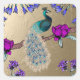 Un pavo real colorido está encaramado en una rama adornada con flores vibrantes. El fondo tiene un tono dorado con detalles texturados, realzando la elegancia general de la escena.