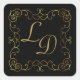 Elegante pegatina cuadrado, con gráficos de un desplazamiento como marco de tono dorado, contra un fondo negro. Personalizar las letras amarillas doradas con el monograma de la novia y el novio. Excelentes como focas para los sobres de invitación a la boda.