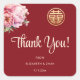 Boda chino te agradece pegatina con un símbolo de doble felicidad dorado y peonías rosadas en un fondo rojo marrón.