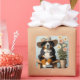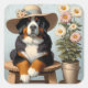 Pegatina Cuadrada Perro de montaña de Berna con Gorra y flores