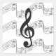 Tres empleados ondulados de música detrás de un trinquete. Este diseño gráfico negro y gris sobre blanco encantará al músico o amante de la música. Diseño de SusanEileenEvans