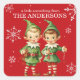 Estos pegatinas divertidos presentan un lindo par de elfos con atuendos rojos y verdes de elfos vintage con regalos y latas de caramelo contra un Navidad de fondo rojo con copos de nieve. Las palabras de arriba dicen "algo de" y luego añaden su apellido o su nombre(s).