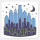 Representación artística de los rascacielos característicos de Filadelfia contra un cielo estrellado en un fresco esquema de color.