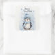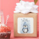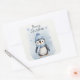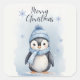 Un encantador ilustracion invernal de un adorable pingüino vestido con un gorra y una bufanda a rayas azules, con un ambiente acogedor y festivo. Los suaves copos de nieve y los suaves tonos azules crean un ambiente mágico de invierno. Perfecto para tarjetas de Navidad, posters, pegatinas y artesanías de temporada.