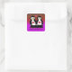 Una pareja de pingüinos adorable sostiene aletas sobre un fondo rosado y rojo sombreado con corazones flotantes. Cada uno tiene un corazón rojo en su barriga. El dicho puede cambiarse como se desee.