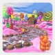 Este es mi diseño de Candyland - una casa de jengibre en un paisaje de caramelos rosados con coloridas copas, osos de goma, cañas de azúcar, pralinas y dulces de algodón en un camino de chocolate.
