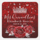 Crea tus propias etiquetas elegantes para personalizar los detalles de tus invitados para una fiesta de cumpleaños, boda u otro evento especial con tema rojo y plata. El diseño floral único ilustrado por Raphaela Wilson representa rosas rojas vintage en acuarela acentuadas en plata, una corona / tiara de princesa y confeti de mariposas brillantes falsas. Agrega tu nombre, monograma, fecha u otro texto personalizado, y siéntete libre de alterar la escritura en caligrafía blanca y la tipografía moderna a otro estilo de tu elección. ¿Necesitas rojo y dorado en lugar de plata y rojo? Si deseas personalizar aún más estas etiquetas de favor personalizadas, verás opciones para hojas de follaje dorado metálico falso, mariposas y gráficos svg para la corona y confeti que puedes cambiar a cualquier color. Estas etiquetas cuadradas personalizadas hacen etiquetas de velas simples y hermosas en bodas de rosas, una fiesta de cumpleaños de quinceañera roja, dulce 16 / dieciséis de princesa de cuento de hadas, ducha de novia, ducha de bebé u otros eventos. Mientras que el texto en estas etiquetas de quinceañera plateadas y rojas dice "Mis Quince Años", puedes redactarlas de nuevo a "amor y agradecimiento" y usarlas como etiquetas de agradecimiento para detalles de invitados, etiquetas de regalo, sobres y otros artículos de papelería. Categoría: etiquetas de boda de rosa roja personalizadas; etiquetas de quinceañ
