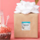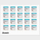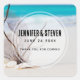 Boda gracias pegatinas con una preciosa fotografía. Agua tropical azul y espumosidad en el fondo. Colección de conchas marinas y tallos en una playa de arena blanca.