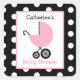 Un pegatina con una ducha de bebé con el ilustracion de un cochecito rosa sobre un fondo de puntos negros de polka blancos. Personaliza con tu nombre.